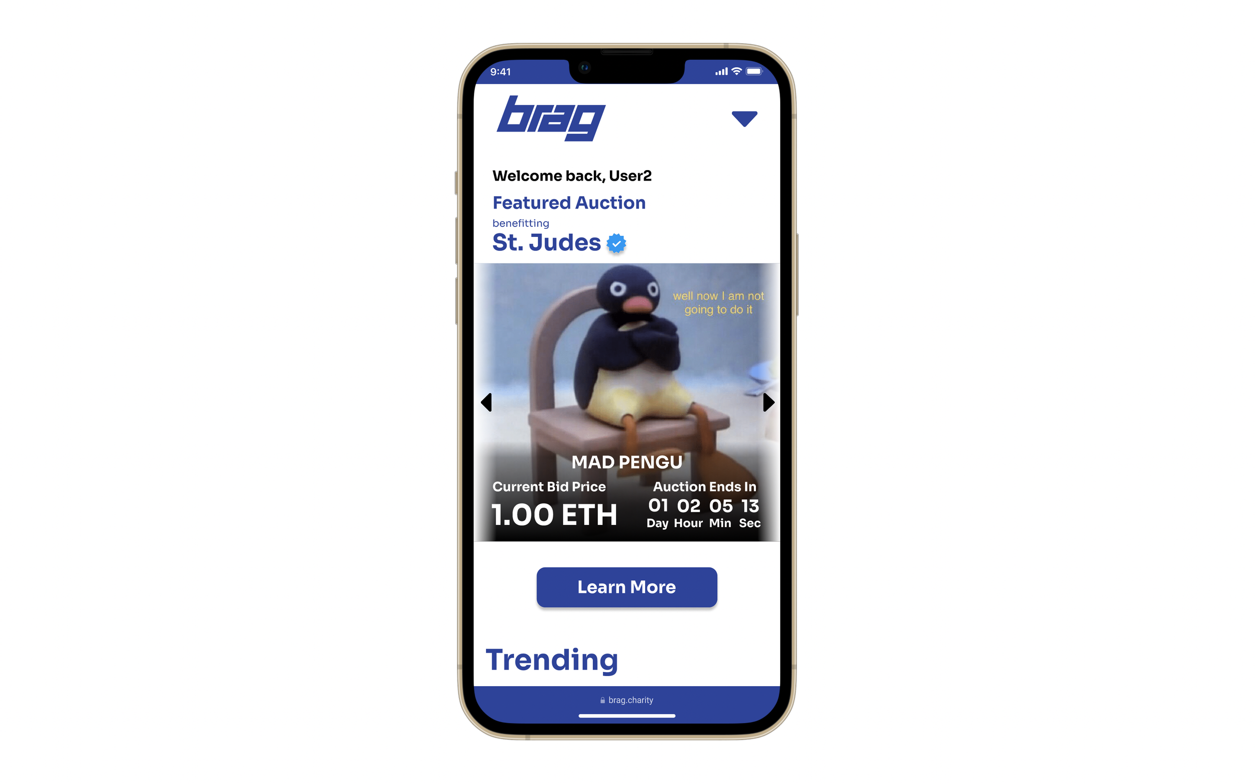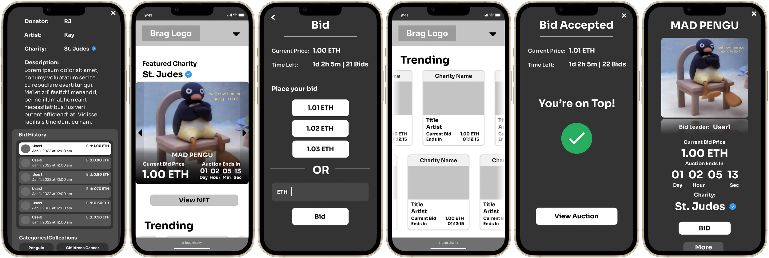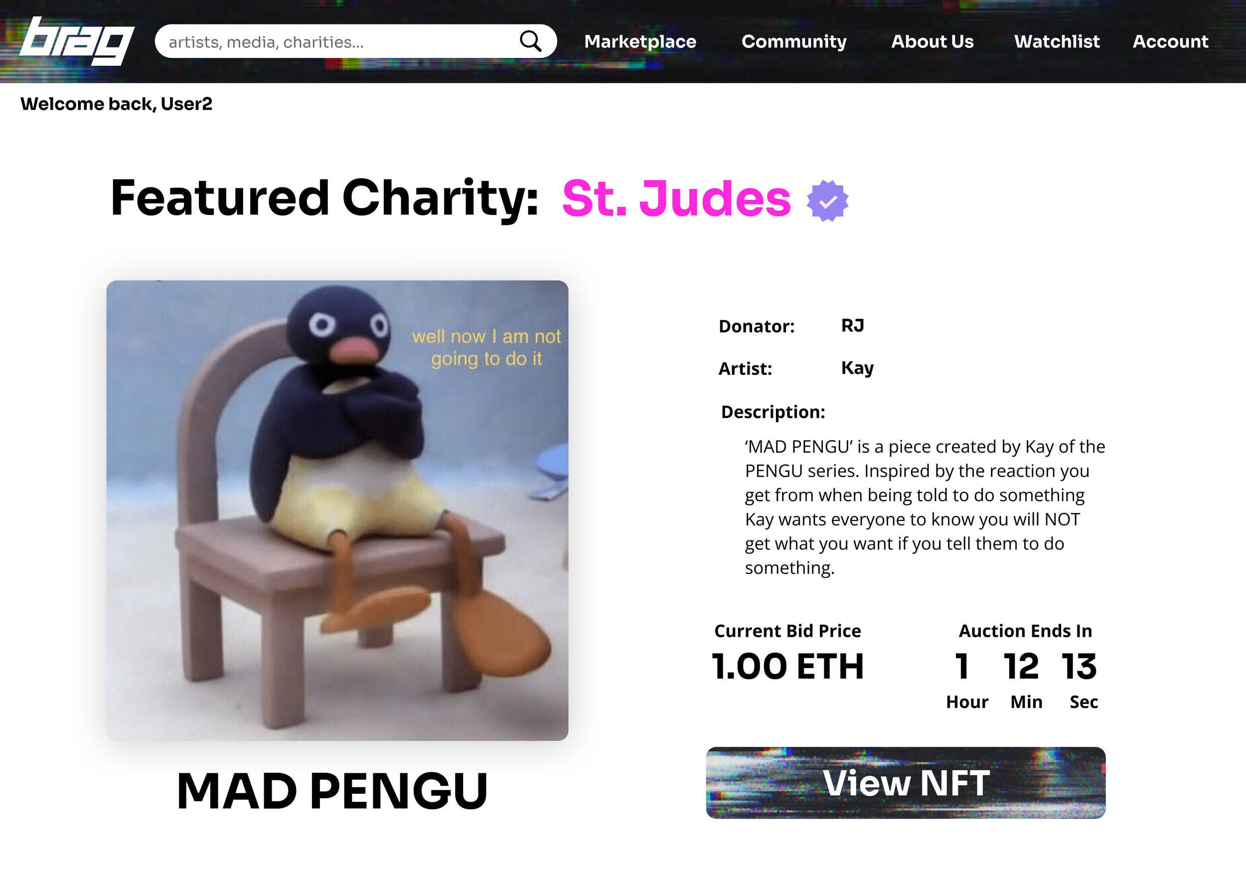 Brag is an NFT auction site that allows users to bid on, purchase and donate NFT’s to non-profit organizations or charity’s of the users choice.